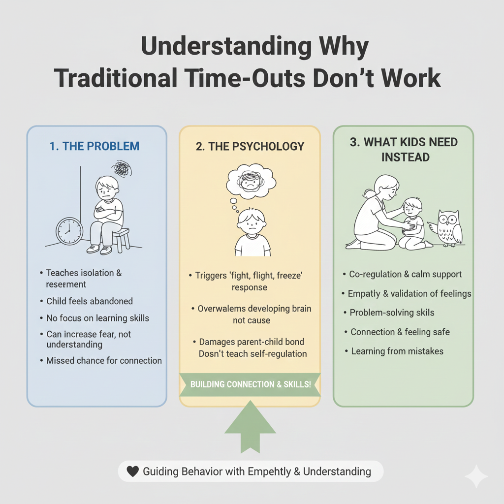The isolation paradox: When children are already dysregulated emotionally, isolation often intensifies distress rather than promoting calm. A child experiencing big emotions needs co-regulation from a caring adult, not solitary confinement. The developing brain lacks the capacity for self-soothing that time-outs assume.