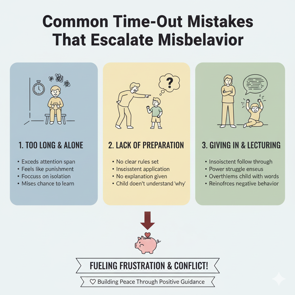 Using time-out for every infraction: When time-out becomes the default response to all misbehavior, it loses meaning and effectiveness. Different situations require different approaches.